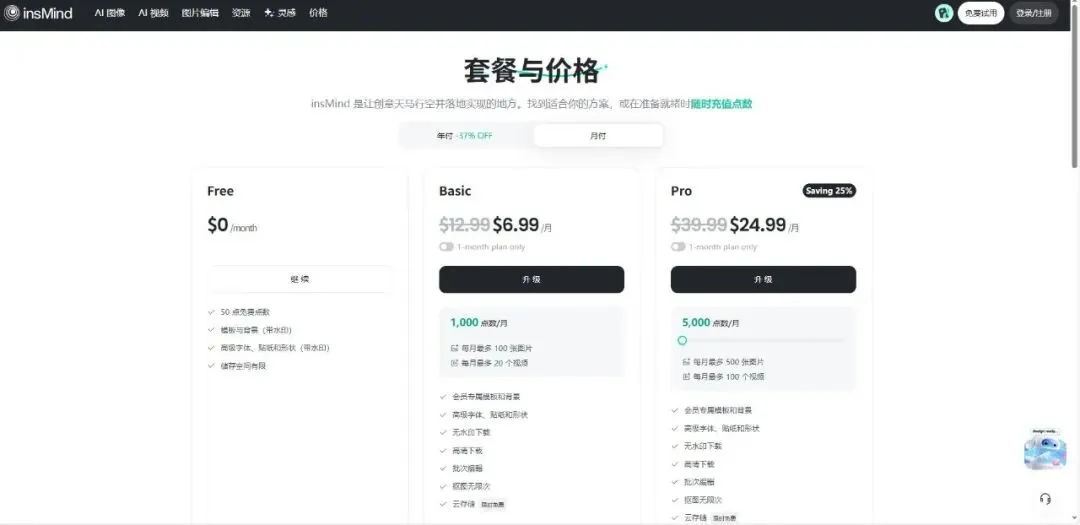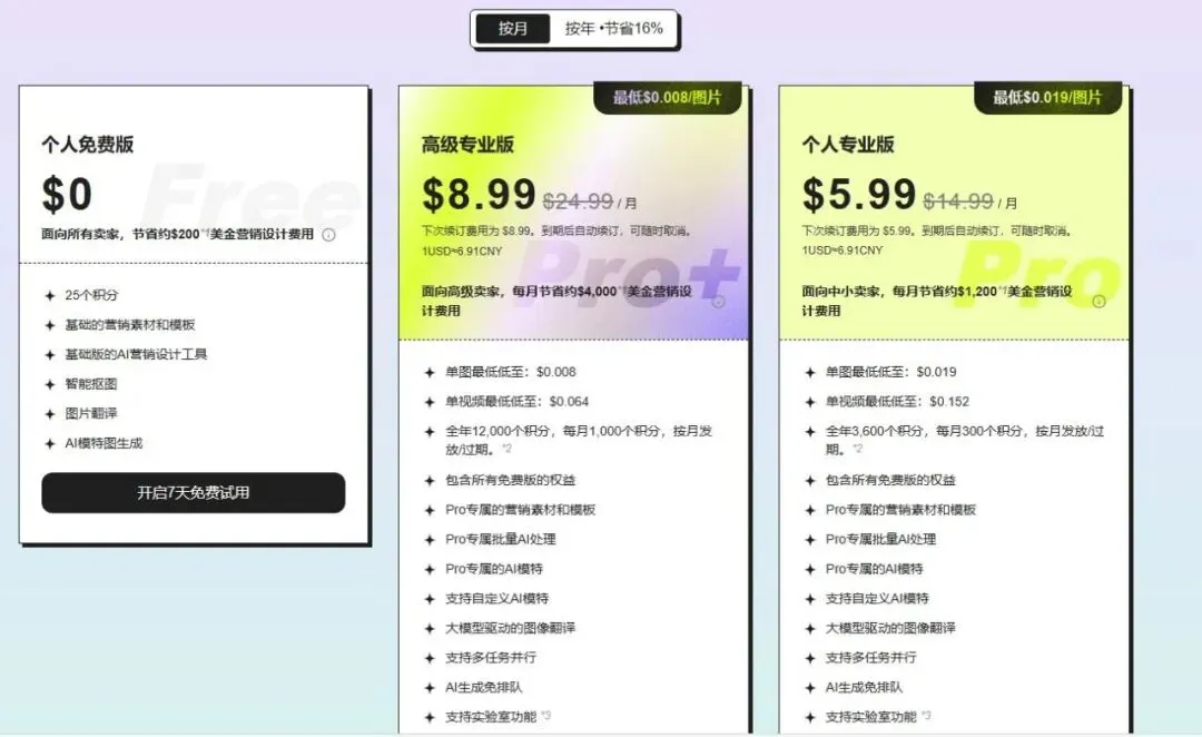 :$4.99/月起,提供不同额度的积分,从20积分/月到2000积分/月不等,价格分别为$4.99、$19.99、$34.99、$79.99、$139.99和$249.99。