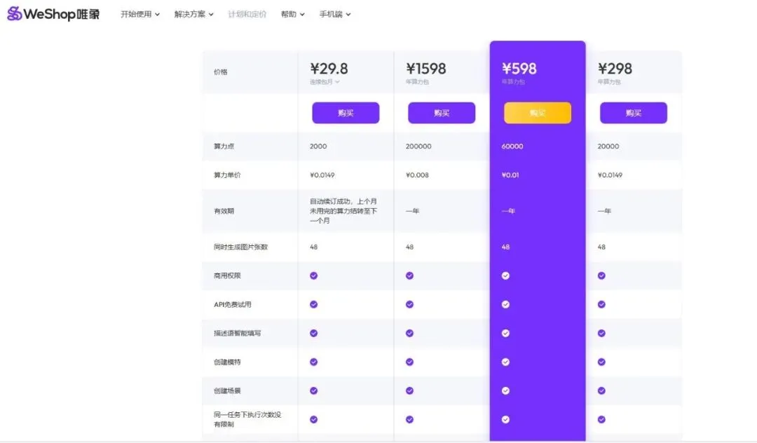 :AI绘图、抠图、场景图、模特、商品图、AI穿衣;0.01元10000点能量、0.02元35000点能量、0.03元80000点能量、支持自定义充值。