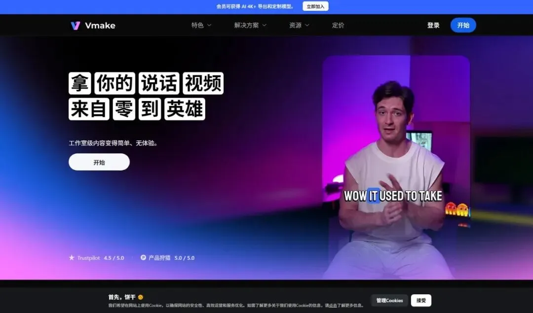 Vmake将自己定位为让“工作室级内容”变得简单易得,无需专业经验。它专注于解决口播视频创作者(如网红、营销人员、教育者)的核心痛点:如何快速、高质量地制作和优化视频,从而吸引观众并扩大传播。