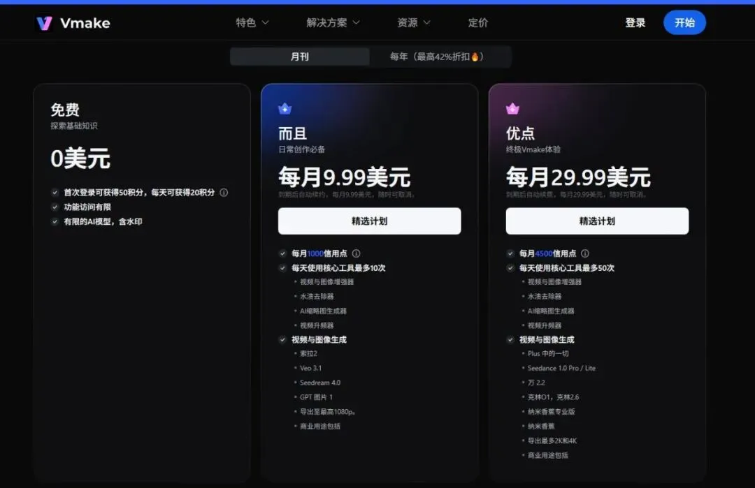 :注册账号可获得5个免费积分,体验Vmake AI的基本功能,包括非生成功能的无限免费图像、视频处理和预览次数,无限次数下载SD图像和预览视频。