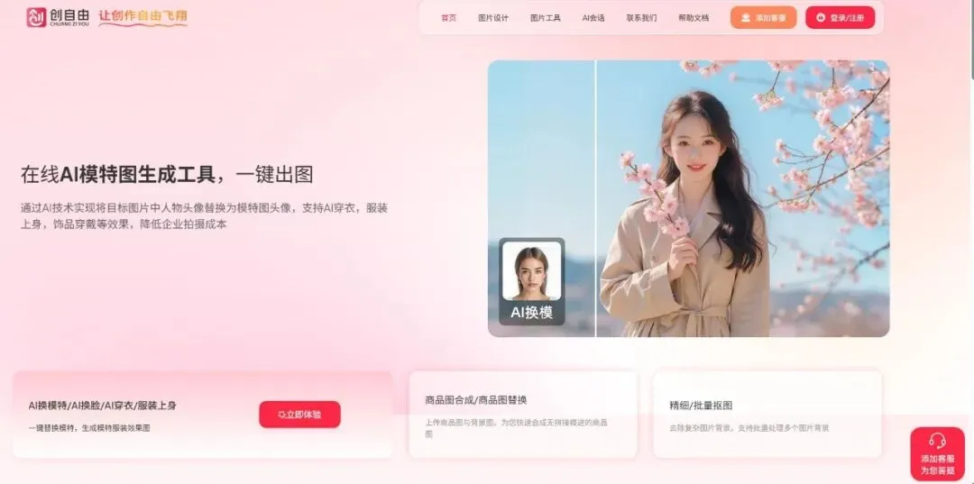 创自由 (Chuangziyou)是一款专注于AI 电商视觉设计与自动化营销素材生产的在线平台。它通过自研的垂直领域 AI 算法,为电商卖家提供了一套低门槛、高效率的视觉解决方案。创自由的核心逻辑是“让 AI 成为卖家的专业摄影师与美工”,尤其在商品场景合成、模特替换和营销海报生成方面表现突出,帮助商家以极低的成本产出具有高转化潜力的视觉内容。