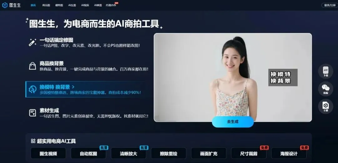 图生生 (TuShengSheng)是一款专为电商行业打造的AI 智能商拍与作图神器。它针对国内(淘宝、京东、小红书等)及海外(亚马逊、TikTok、Shopee 等)市场的视觉需求,通过强大的生成式 AI 技术,帮助商家告别传统高成本的线下实拍。无论是商品测款、主图制作还是投流素材生产,图生生都能通过简单的操作实现“随手一拍,即成大片”。