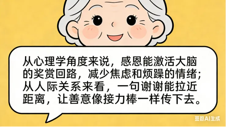 感恩其实有很大的作用,感恩能提升个人幸福感与情绪稳定性,促进人际关系的和谐融洽,还能增强对生活的积极感知与抗压能力。