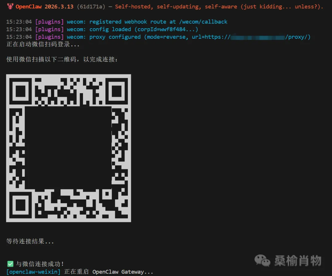 当前openclaw-weixin插件版本是1.0.2,首次启动命令行会显示一个二维码: