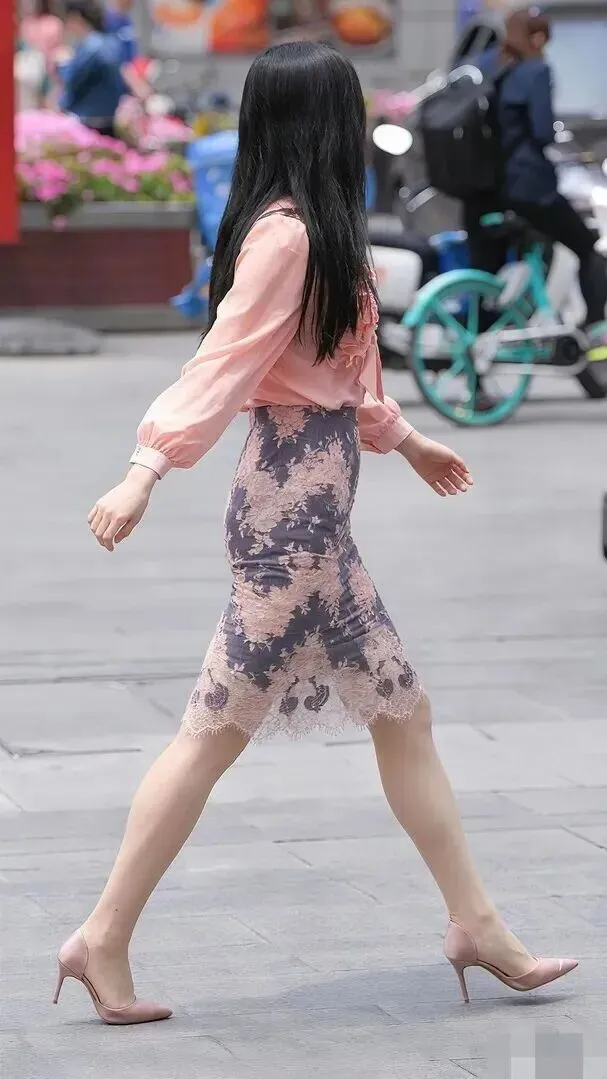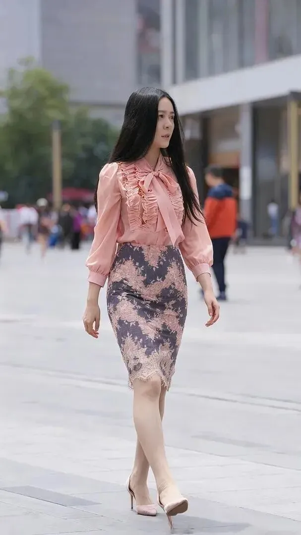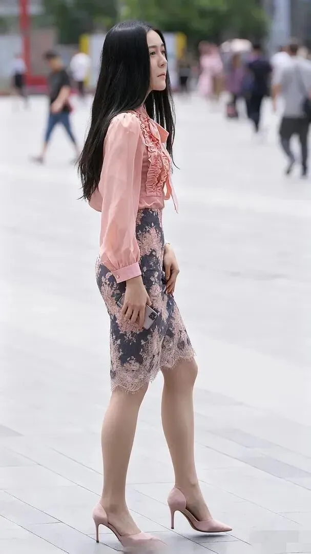 脚上穿的鞋子太好了。同样都是浅粉色细高跟,上衣颜色也是一致的,不会显得过于突兀。细跟设计使腿显得更长,她的行走姿势非常优雅,踏出的每一次响动都像是在为身体说话,“叮叮当当”的声音里带着一份沉着的美,这双鞋给她的气息增添了一份不可取代的存在感。