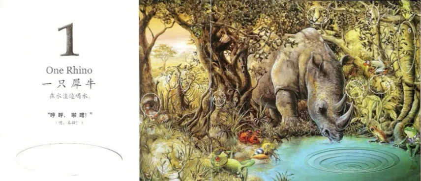 一只犀牛(One Rhino),在水洼边喝水。“哼呼,啪嗒!”(嗯,真甜!)