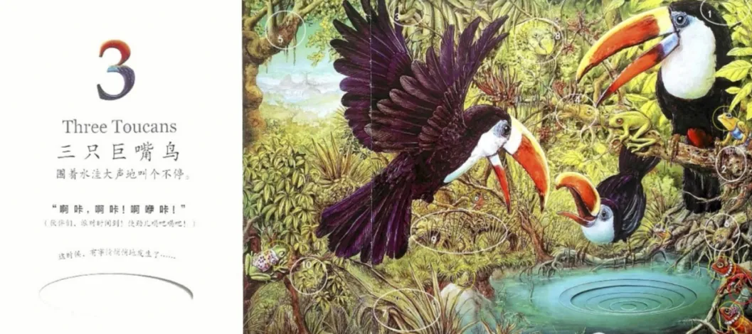 三只巨嘴鸟(Three Toucans)围着水洼大声地叫个不停。“啊咔,啊咔!啊咿咔!”(伙伴们,派对时间到!使劲喝吧喝吧!)这时候,有事情悄悄地发生了……
