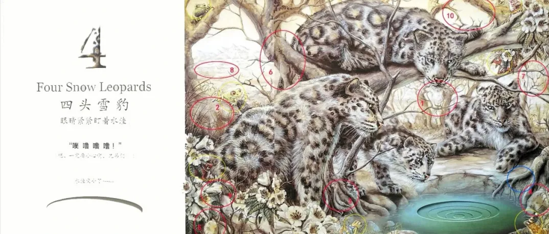 四头雪豹(Four Snow Leopards)眼睛紧紧盯着水洼。“噗 噜 噜 噜!”(嗯,一定要小心啊,兄弟们。)水洼变小了……