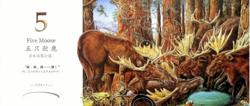 五只驼鹿(Five Moose)在水洼里打滚。“哞 ,哞,哞 —— 咿!”(嘿,把你的蹄子从我耳朵边挪开!)……水洼变得更小了……