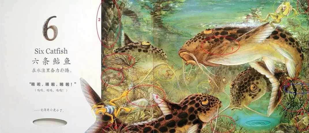 六条鲇鱼(Six Catfish)在水洼里奋力扑腾。“啪 啦,啪 啦,啪 啦!”(呜呜,呜呜,呜呜!)……水洼变得更小更小了。
