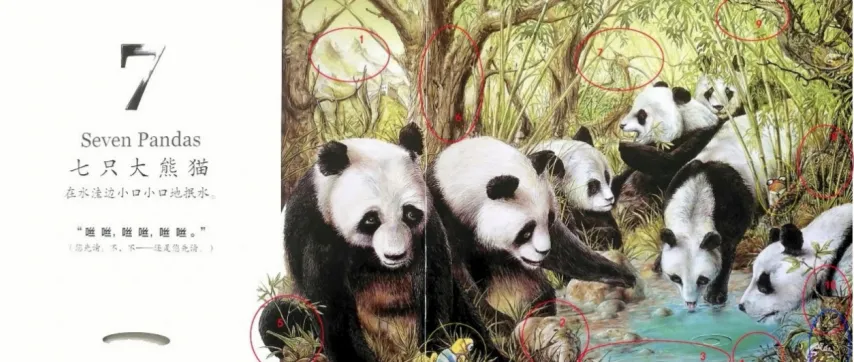 七只大熊猫(Seven Pandas)在水洼边小口小口地抿水。“咝 咝 ,咝 咝,咝 咝。”(您先请。不,不——还是您先请。)