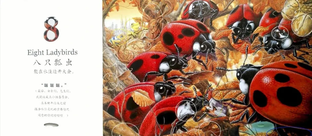 八只瓢虫(Eight Ladybugs)聚在水洼边开大会。“嗡 嗡 嗡。”(最后,女士们,先生们,我提议成立小组委员会,在本财年结束之前报告水位危机的重要情况。同意的请说嗡嗡嗡。)