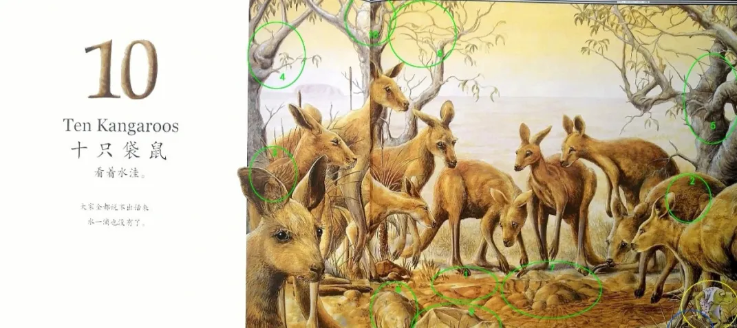 十只袋鼠(Ten Kangaroos)看着水洼。大家全都说不出话来。水一滴也没有了。