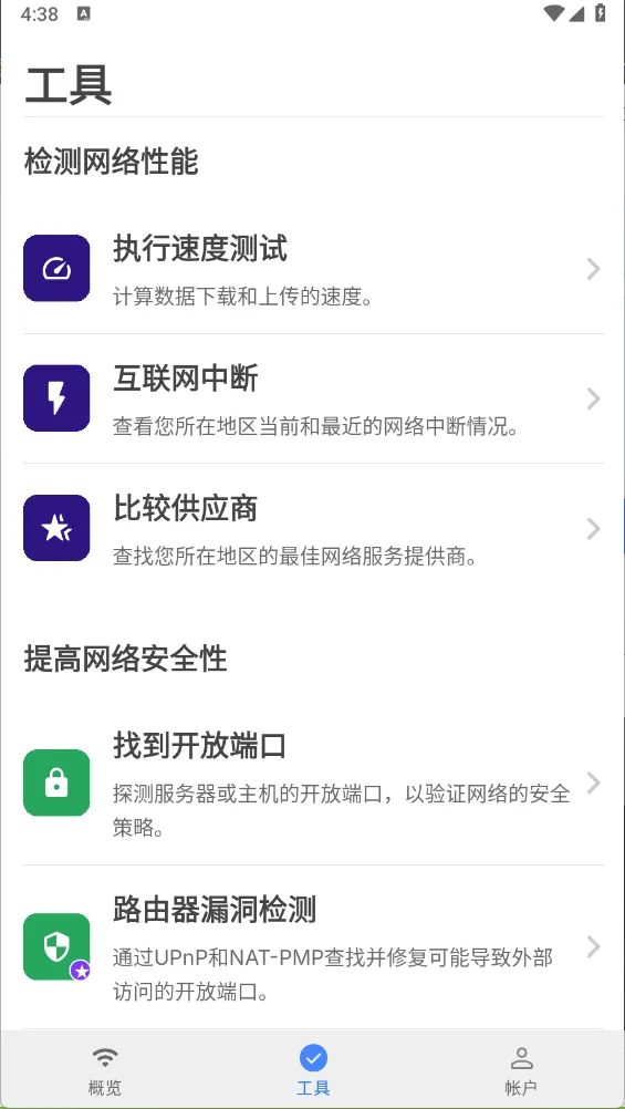 自带很多实用工具,包括测速等工具