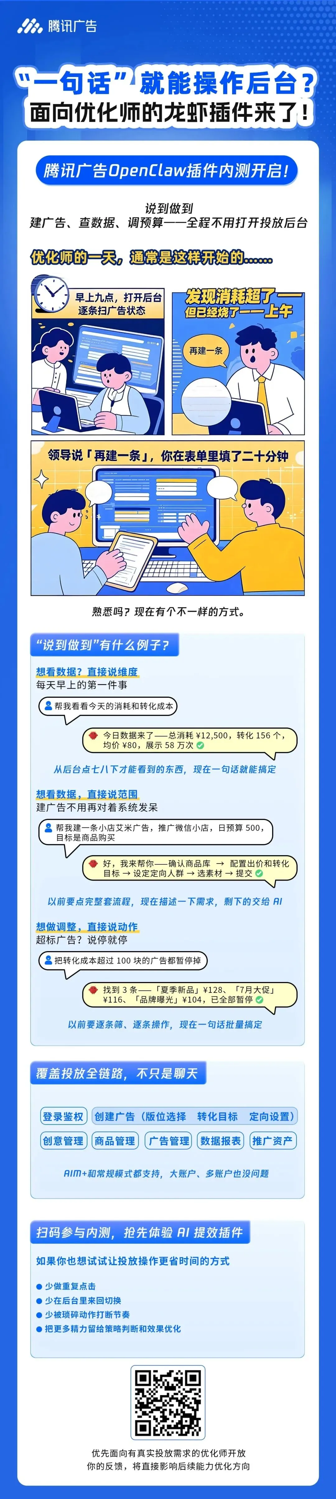 【工具】腾讯广告OpenClaw插件来了!“一句话”就能操作后台,内测招募正式开启! 国内服务推荐 【建站支持】微信小程序搭建、网站搭建(可做SEO) 【技术支持】广告技术支持:加粉通、CID 【达人建联】让国内的外籍达人帮你推广 【运营支持】广告素材拍摄+剪辑 【运营支持】新华社媒体矩阵广告位(直播、发稿等) 【推广方案】保证客资量(ToB业务)的组合营销玩法 【推广方案】让用户在抖音搜索到你们的信息 【推广方案】打造热点,话题冲刺:热搜榜、同城榜、娱乐榜等 【推广方案】让用户在AI工具推荐你们的信息 【推广方案】让顾客帮你一键发种草笔记 【开户支持】广告账户开通:国内腾讯、快手等,海外facebook、Tik Tok、Google、Yandex等。请联系小助手~ 点分享 点收藏 点点赞 点在看