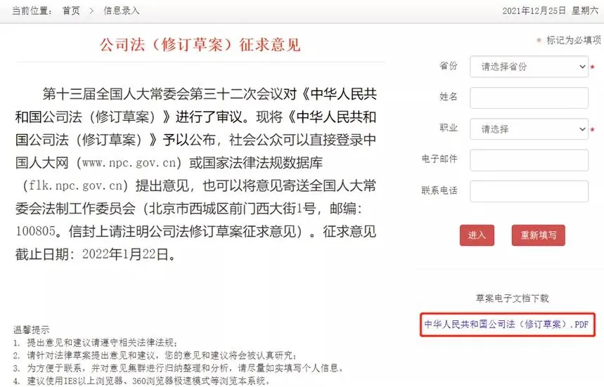 第十三届全国人大常委会第三十二次会议对《中华人民共和国公司法(修订草案)》进行了审议。12月24日,修订草案向社会公开征求意见。