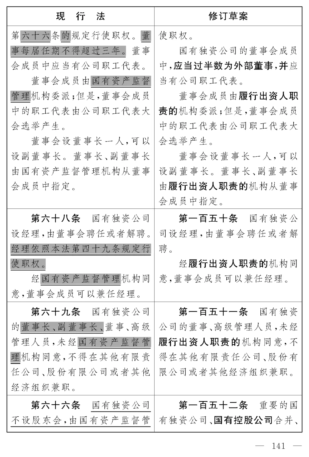 深入总结国有企业改革成果,在现行公司法关于国有独资公司专节的基础上,设“国家出资公司的特别规定”专章:一是,将适用范围由国有独资有限责任公司,扩大到国有独资、国有控股的有限责任公司、股份有限公司(修订草案第一百四十三条)。二是,明确国家出资公司由国有资产监督管理机构等根据授权代表本级政府履行出资人职责(修订草案第一百四十四条);履行出资人职责的机构就重要的国家出资公司的重大事项作出有关决定前,应当报本级政府批准(修订草案第一百五十二条);国家出资公司应当依法建立健全内部监督管理和风险控制制度(修订草案第一百五十四条)。三是,落实党中央有关部署,加强国有独资公司董事会建设,要求国有独资公司董事会成员中外部董事应当超过半数;并在董事会中设置审计委员会等专门委员会,同时不再设监事会(修订草案第一百四十九条、第一百五十三条)。
