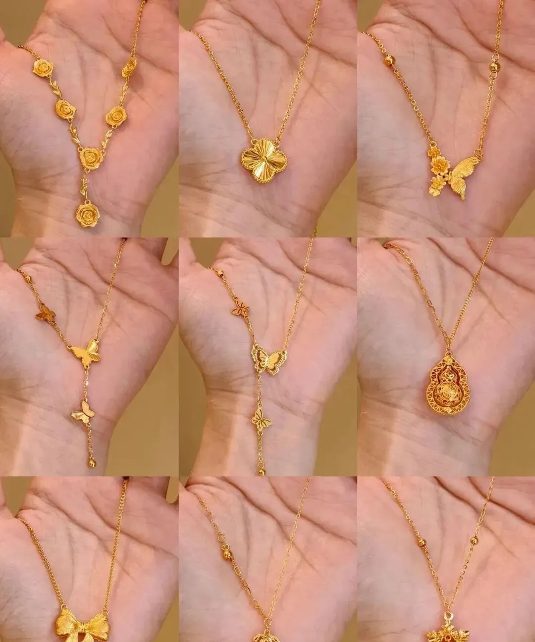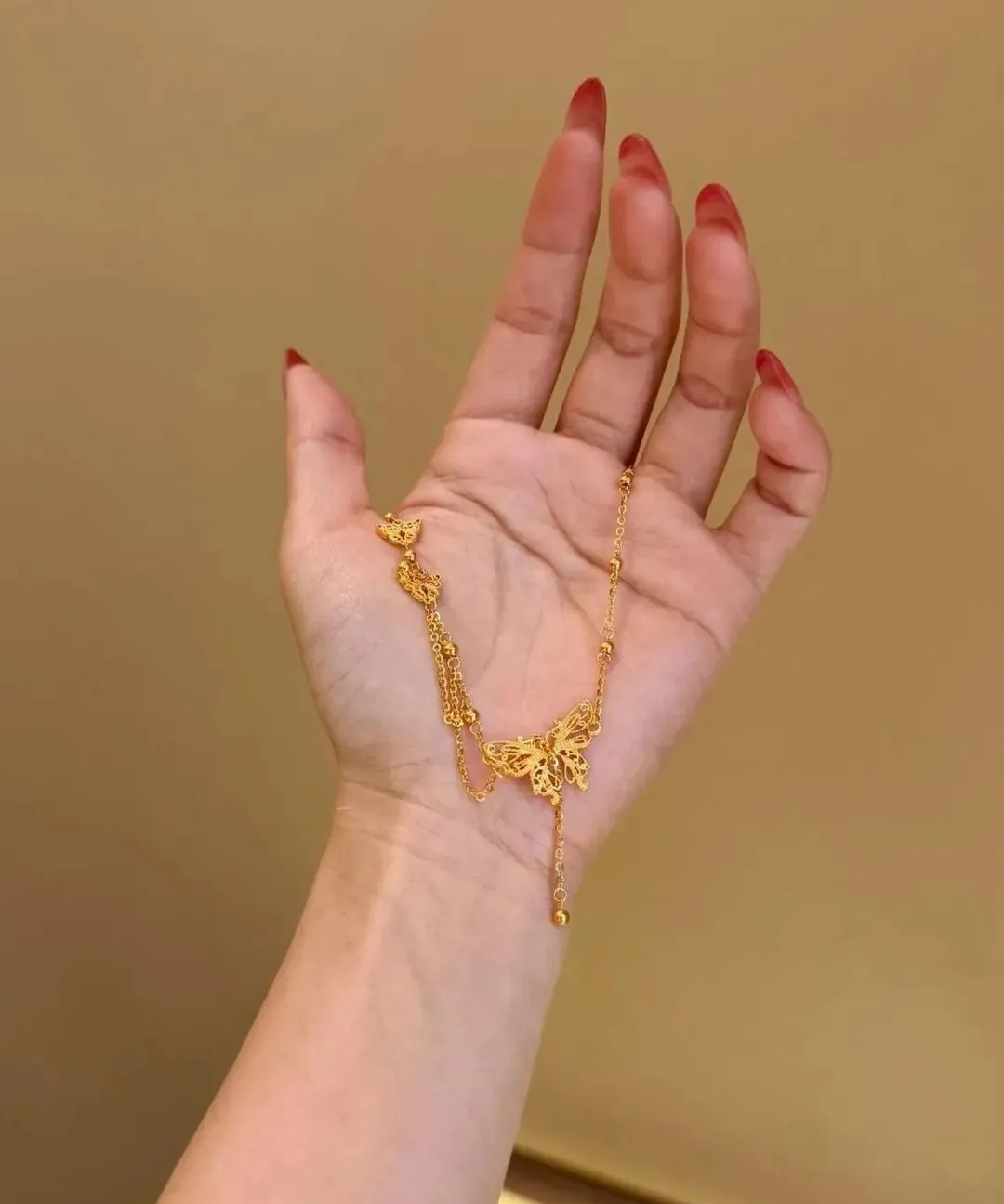 后来我就开始关注这类设计感强的黄金首饰 慢慢发现其实市场上有很多宝藏款 只是大家不太注意而已 比如那种镂空的蝴蝶款 还有带小珠子坠的Y字链 甚至还有那种复古宫廷风的水滴坠 每一款都很特别 不会撞款 戴出去辨识度特别高