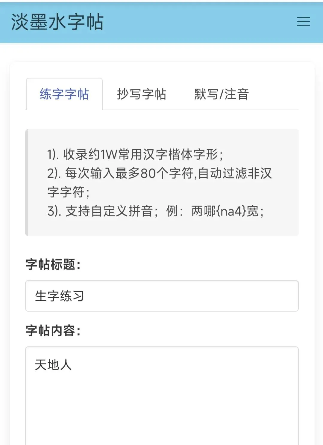 这是一个专门生成字帖的在线工具,家里有小孩练字,或者自己想静下心来写写字,用它很方便。