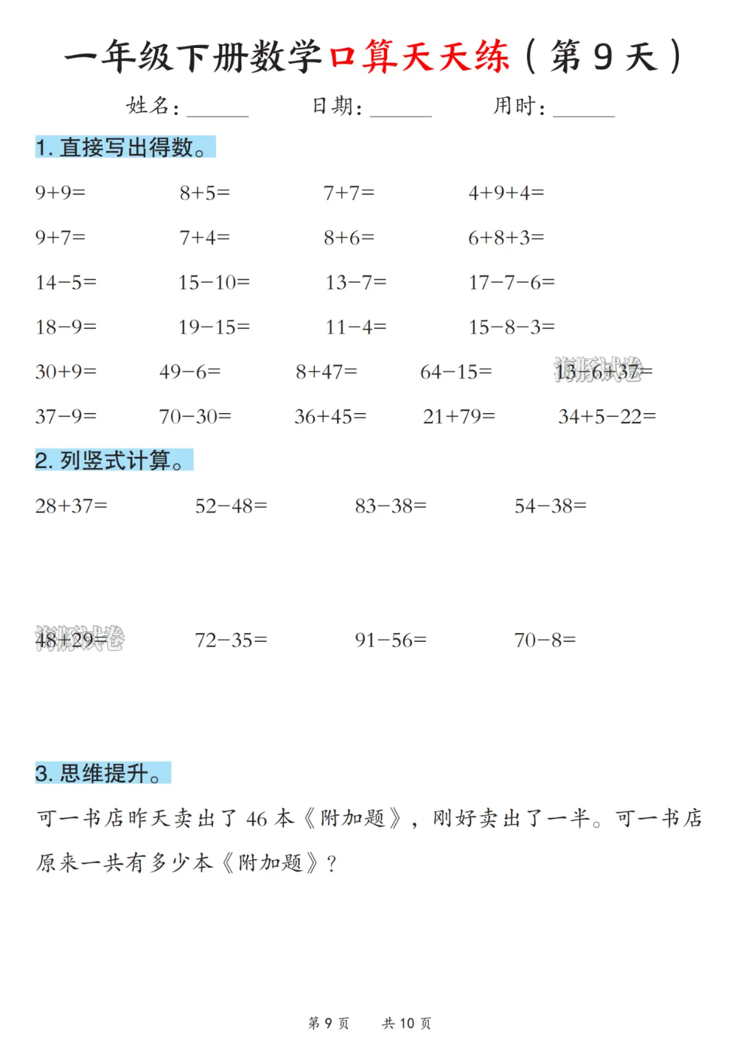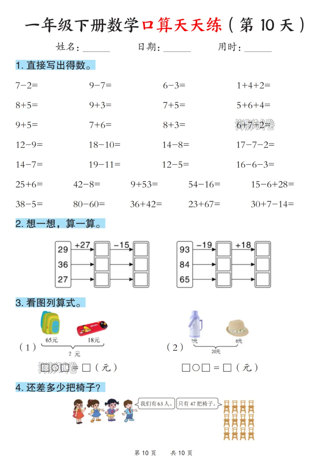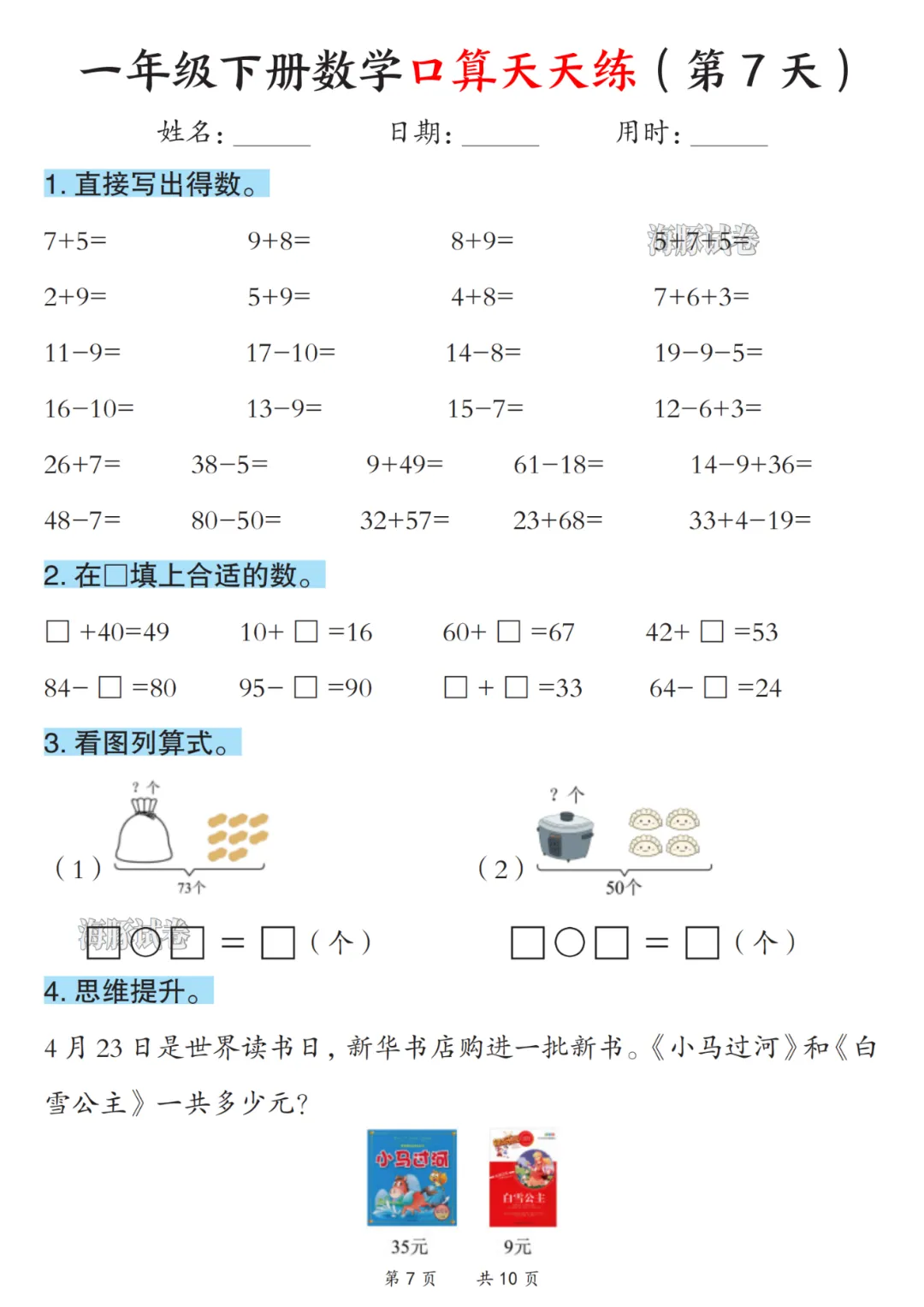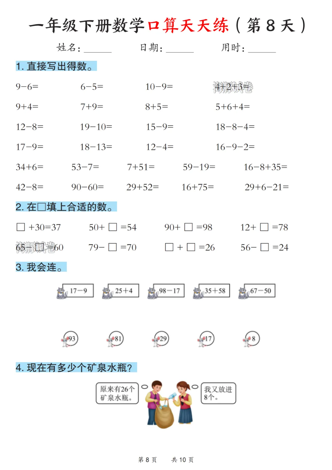 2026春《一年级下册数学口算天天练》电子版可打印