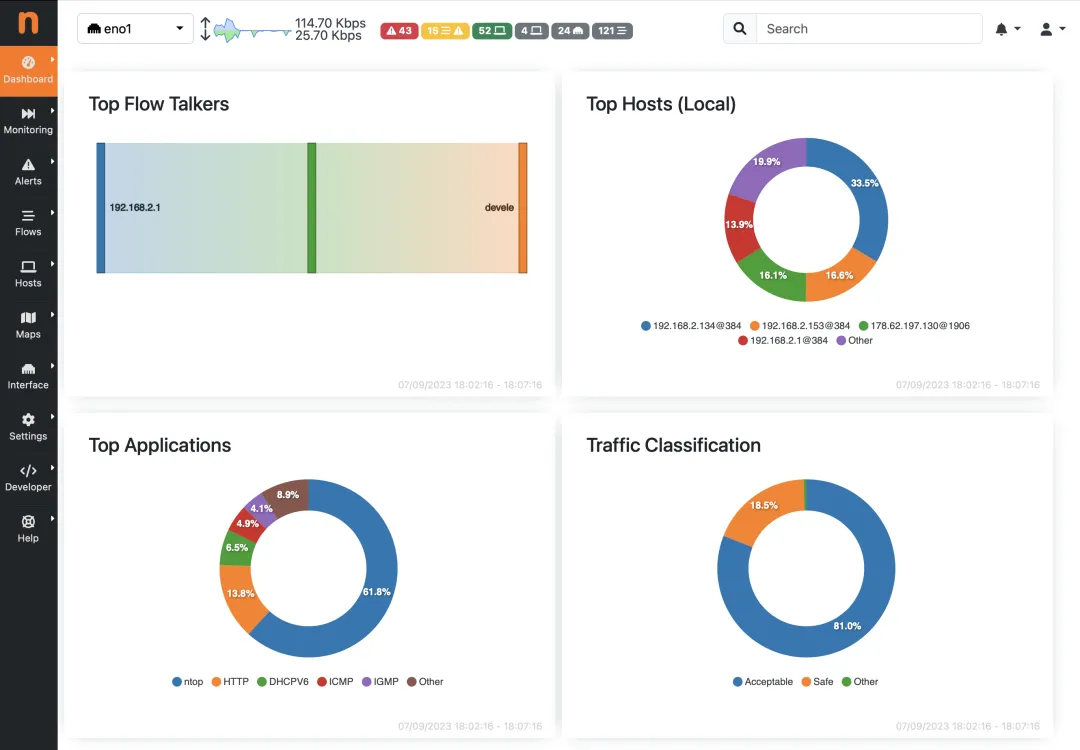 ntopng 是老牌网络工具 ntop 的”下一代”版本,在 GitHub 上已经攒了 7.5k+ 的 Star。它最香的地方在于——完全基于 Web 的图形化界面。你不需要在终端里敲一堆 tcpdump 命令,也不需要面对密密麻麻的数据包解码,打开浏览器就能看到一个清清楚楚的流量仪表盘。