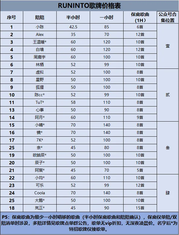 RUNINTO歌牌合集 以下为价格表一览 以及歌牌的音介-歌单-歌曲片段展示 更多精彩在 合集壹RUNINTO歌牌合集壹 合集贰RUNINTO歌牌合集贰 合集叁RUNINTO歌牌合集叁 合集肆RUNINTO歌牌合集肆 合集伍 价格表合集 ps:保底歌曲为最少一小时唱够的歌曲(半小时保底歌曲需要和陪陪确认)保底仅单陪/双陪消单时涉及,多陪详情见歌单点单群公告,歌单无vip折扣,无凌晨深夜价。名字后为*为特招歌牌。 期待你的聆听