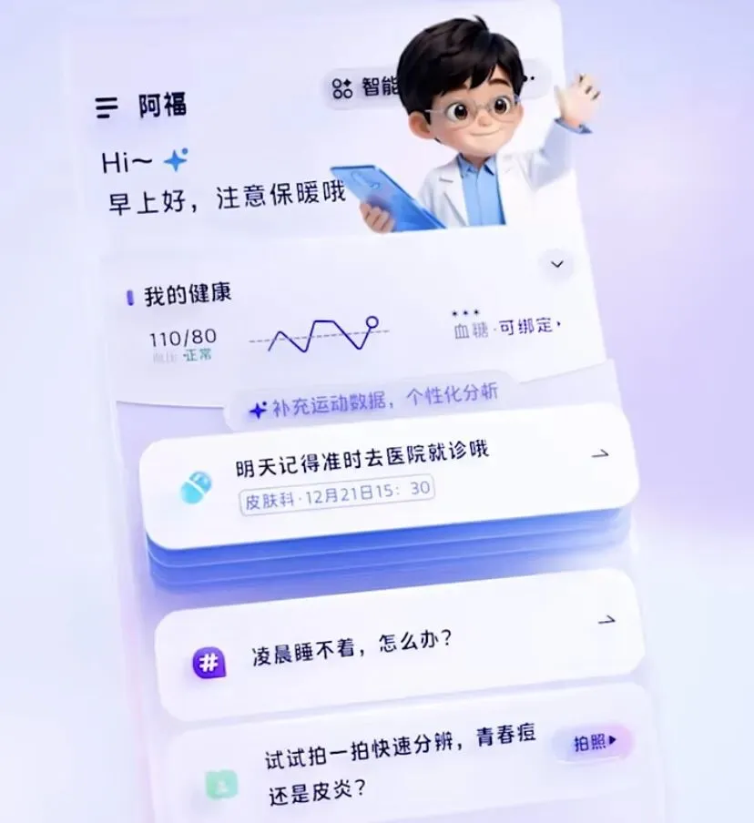 对于那些平时工作忙、没时间跑医院,或者家里有老人需要长期照顾的人来说,阿福真的是一个“常驻的健康顾问”。不用专门花时间去查资料,不用排队挂号,有任何健康疑问,打开APP就能得到专业解答;日常饮食、用药有提醒,健康数据有跟踪,真正把健康管理变成了一件轻松的事。