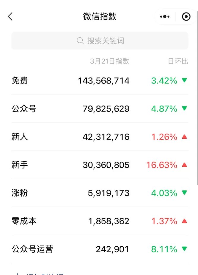 感觉靠不住,让数据说话。打开“微信指数”小程序,输入你想用的关键词。比如,同时对比“公众号”、“自媒体”、“副业”、“新人”。