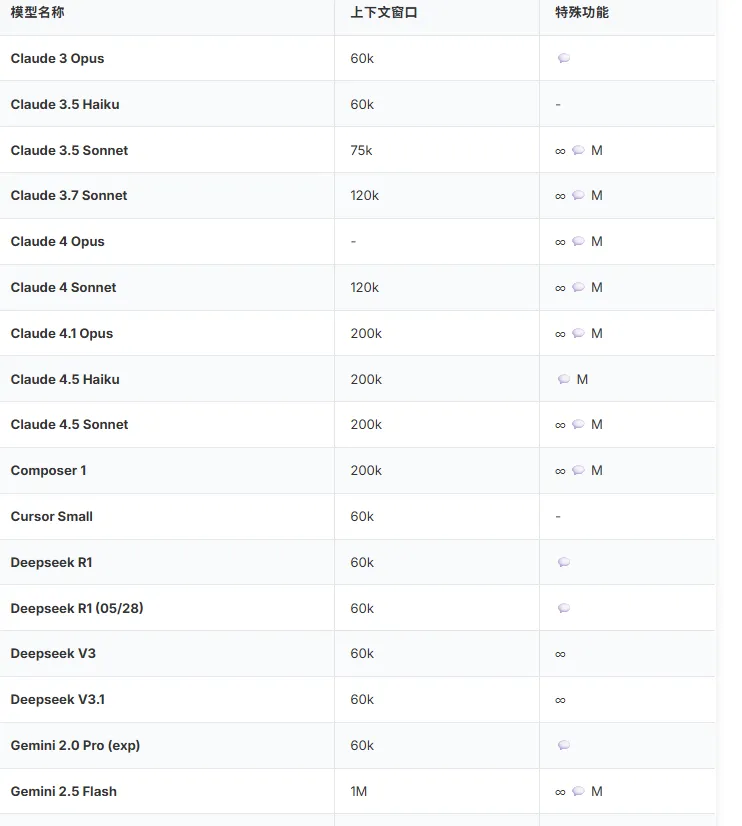 从Cursor官网可以看到,它当前支持的所有AI模型,包括上下文窗口大小和特殊功能。