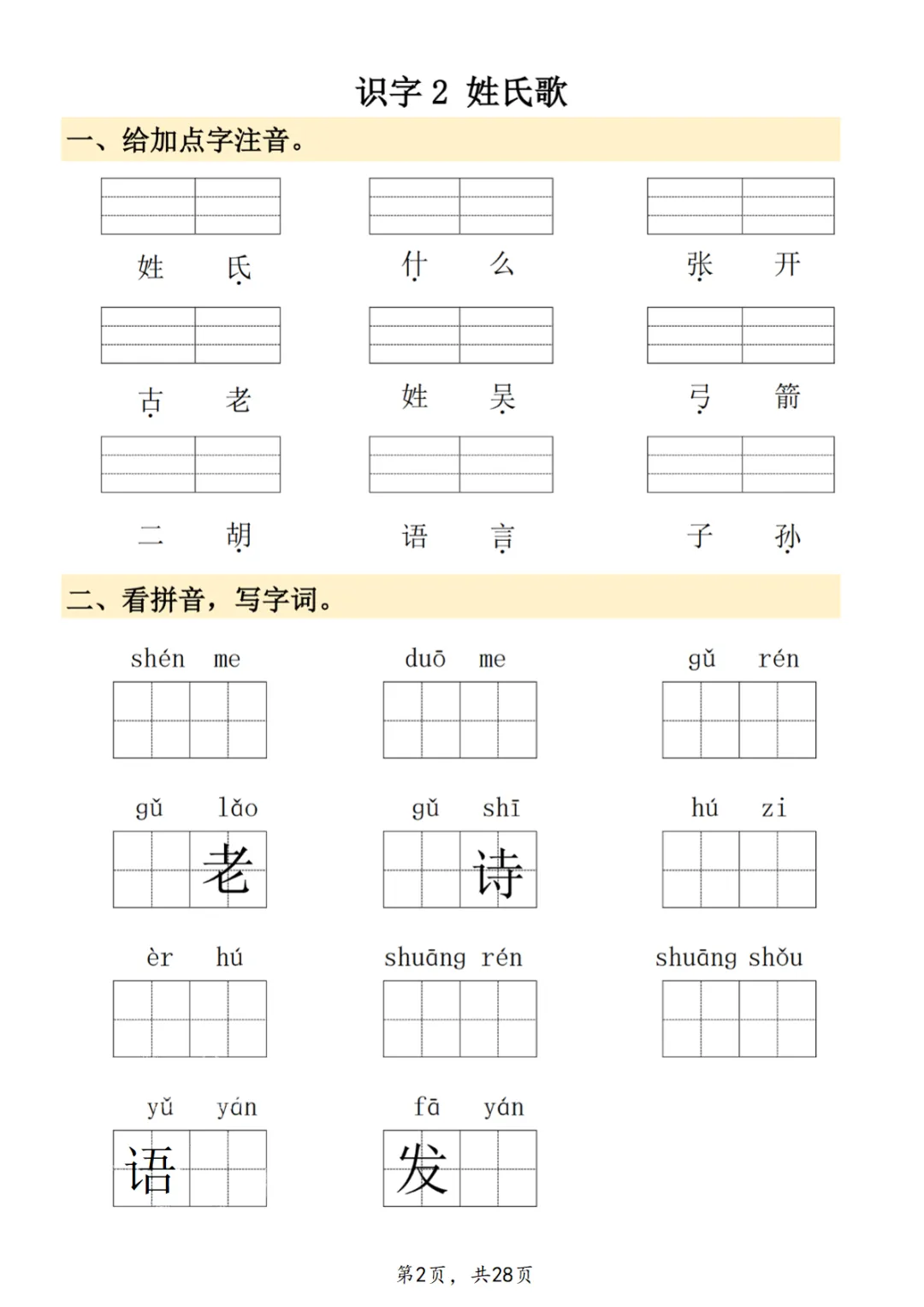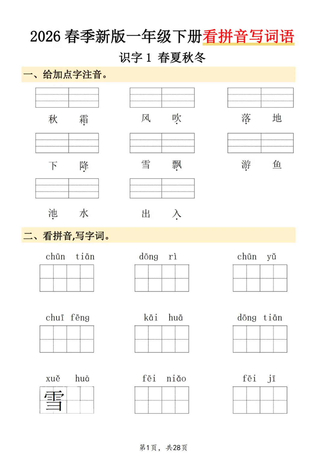 26春一年级(下)语文看拼音写词语,PDF电子版,可下载打印