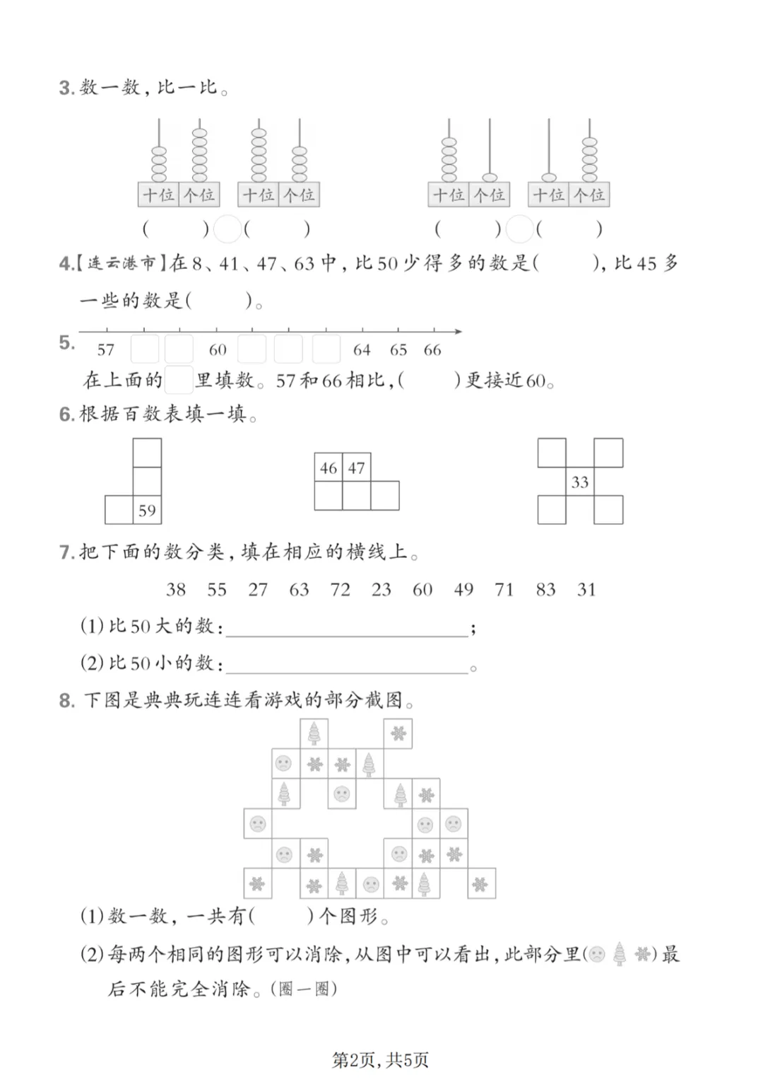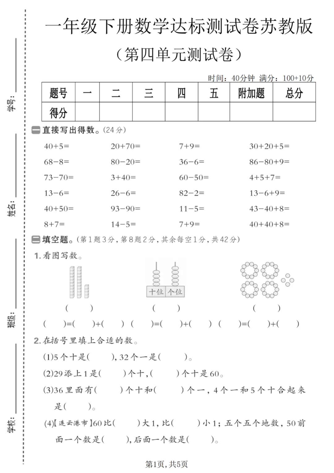 【免费下载】一年级(下)数学 第四单元达标测试卷《苏教版》,PDF电子版,可打印