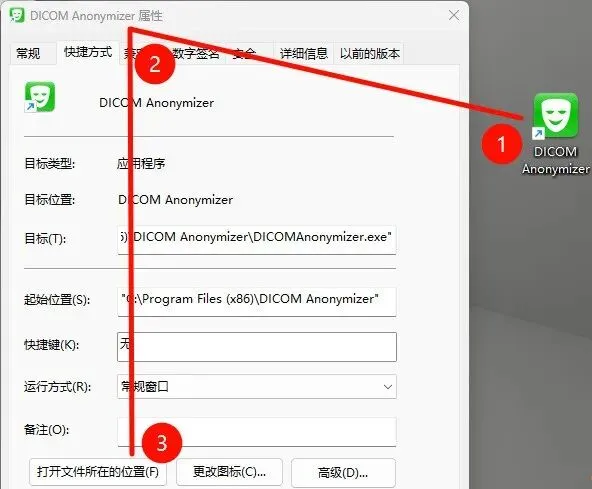 5、选择桌面上“DICOM Anonymizer”图标并右键,在弹出窗口中点击“打开文件所在的位置”(如图所示)