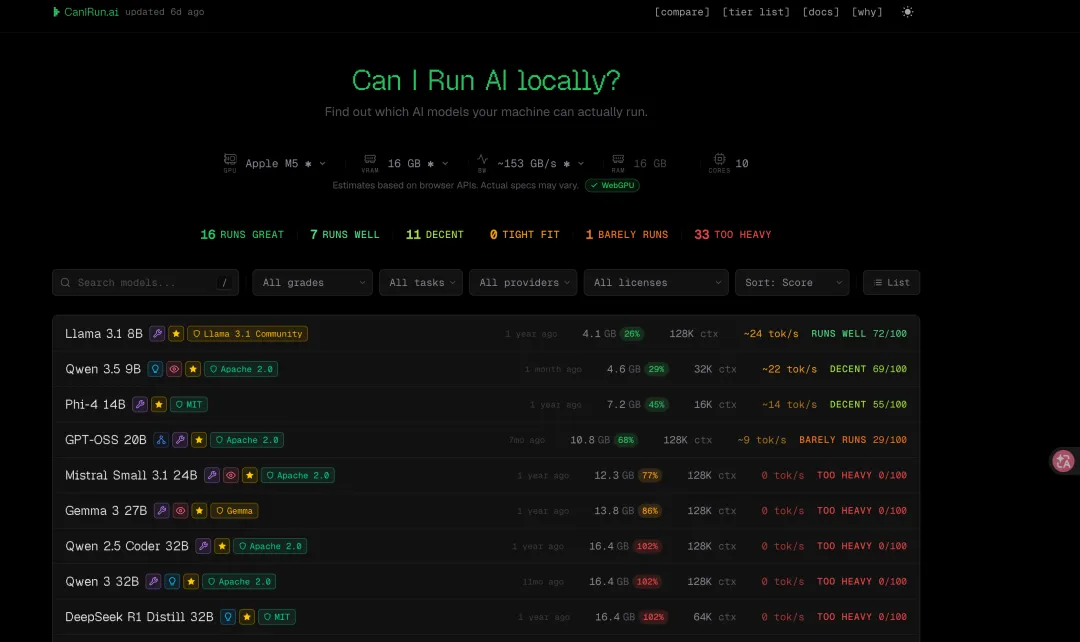 它可以去自动检测你的电脑配置,告诉你哪些大模型能够去跑的有多快,哪些你的电脑根本就带不动。