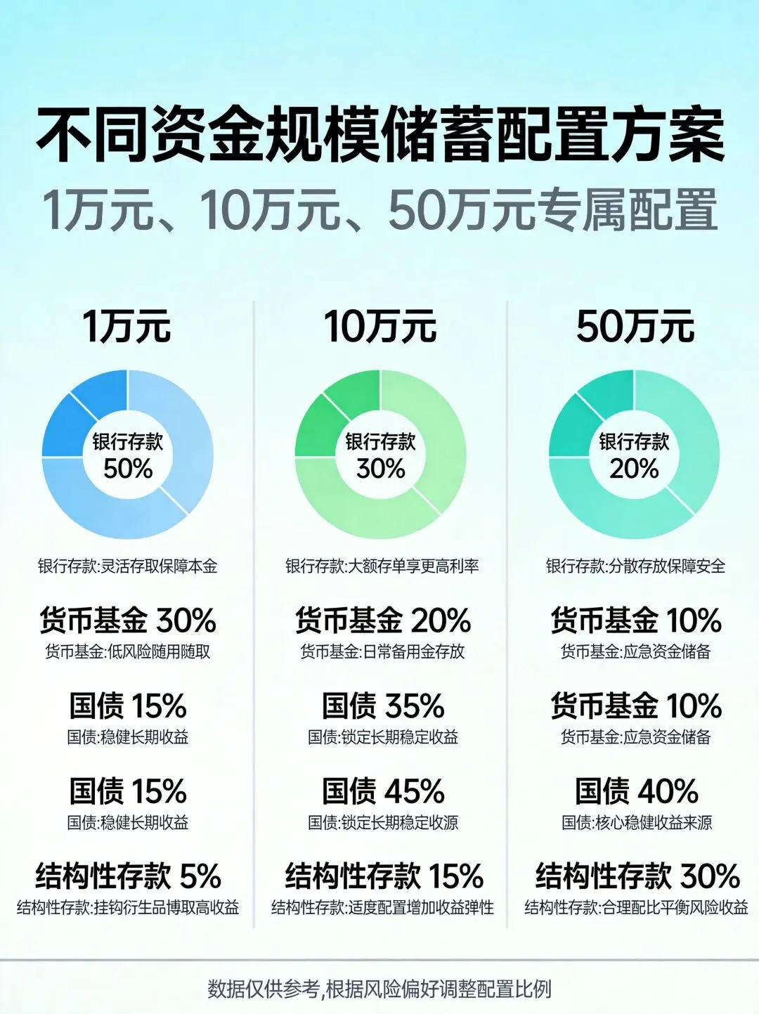 方案B:中等资金(10万元)配置 – 40%储蓄国债(3年期):安全核心,收益稳定 – 30%城商行定期存款(3年期):追求相对高收益 – 20%货币基金:流动性储备 – 10%结构性存款:适度参与收益波动产品