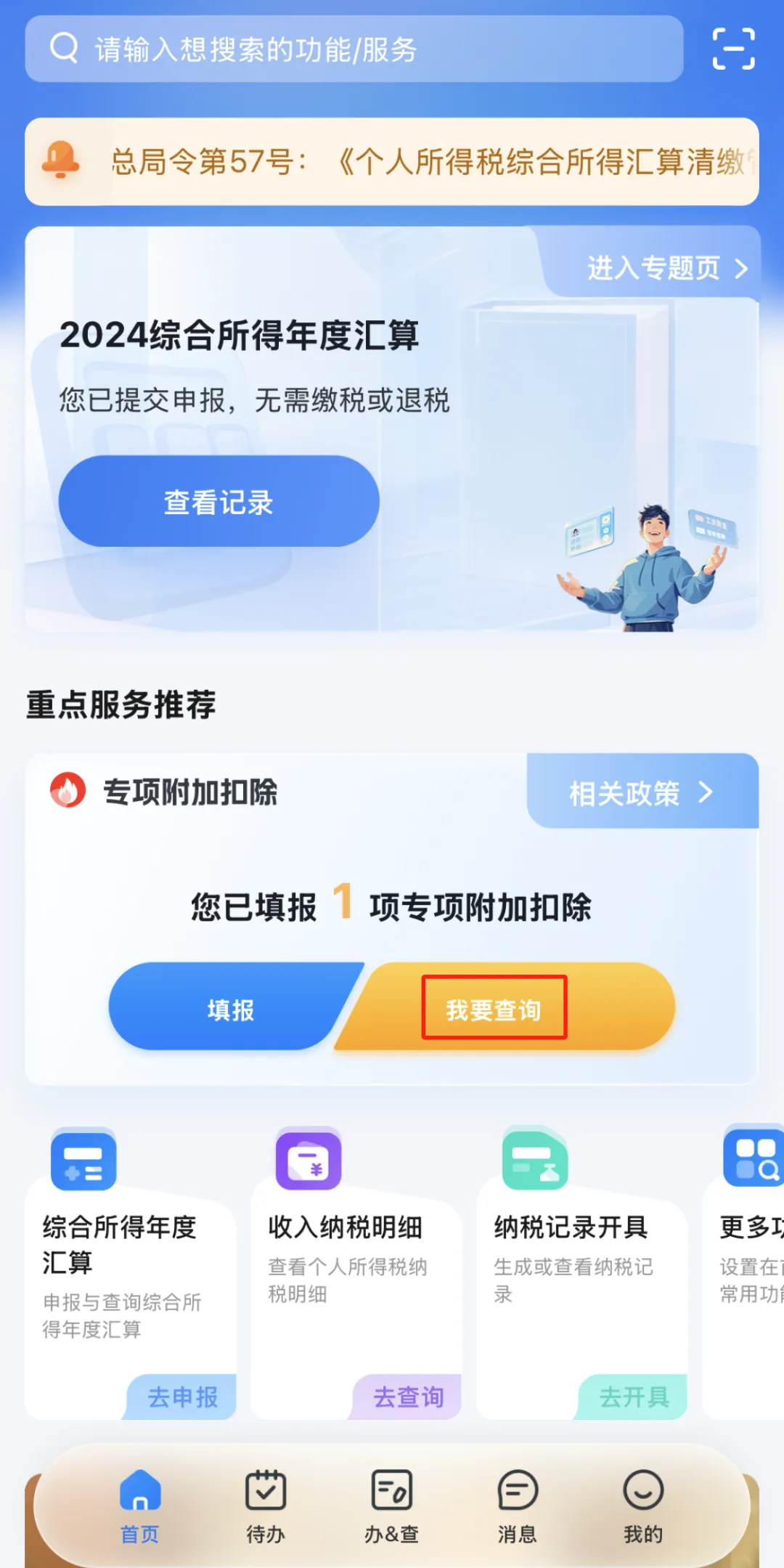 第一步:在个人所得税App的首页找到专项附加扣除,点击“我要查询”。