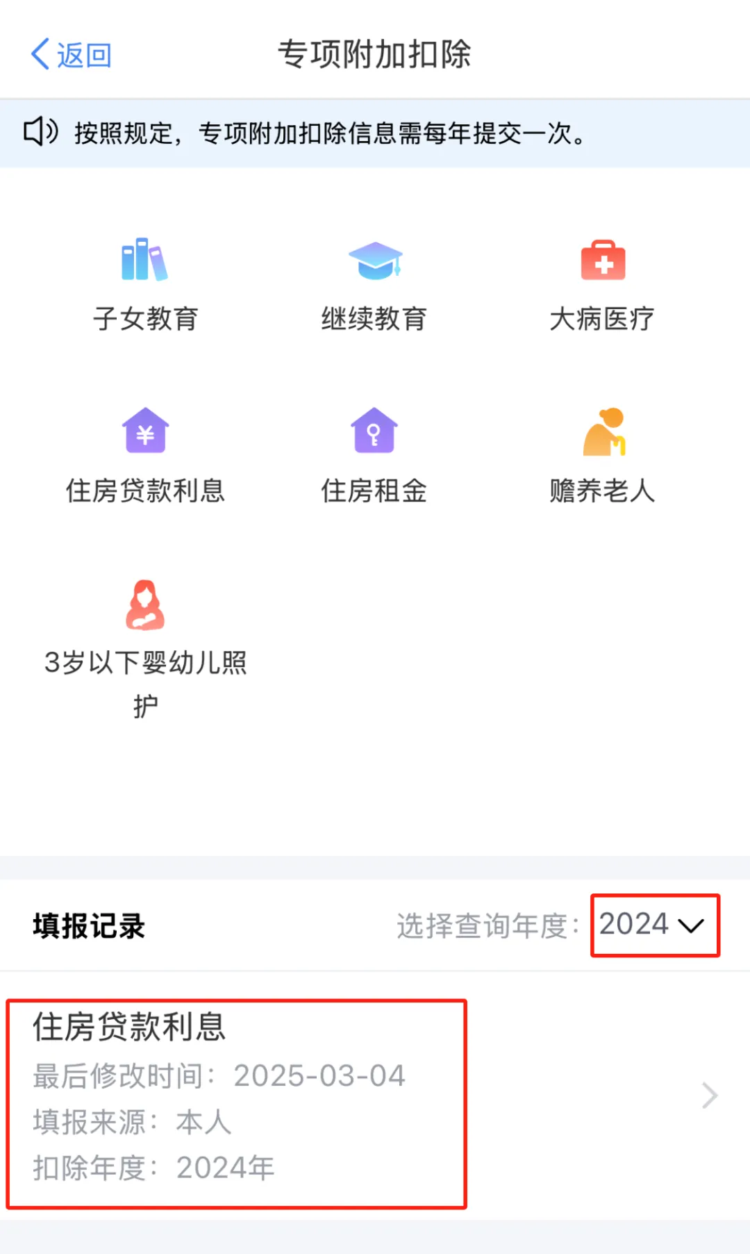 第二步:找到住房贷款利息,点击进入详情页。(通过选择查询年度找到不同年度住房贷款利息填报记录)