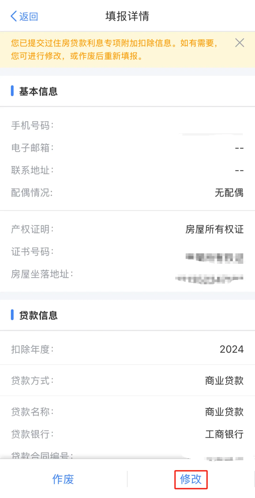 如果您填写的是同一套住房则需要核对各年度贷款合同编号是否填写一致,是否存在中英文括号格式、短横线等符号格式错误,如有,则需要在对应年度的填报详情页面点击【修改】-【修改贷款信息】-【贷款合同编号】。
