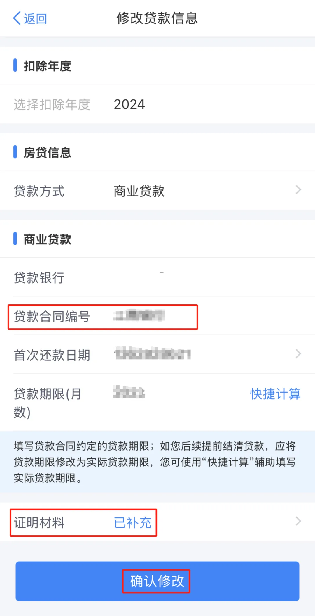 第六步:填写正确贷款合同编号后,点击“确认修改”,同时上传贷款合同、网上银行贷款信息截图等证明材料。