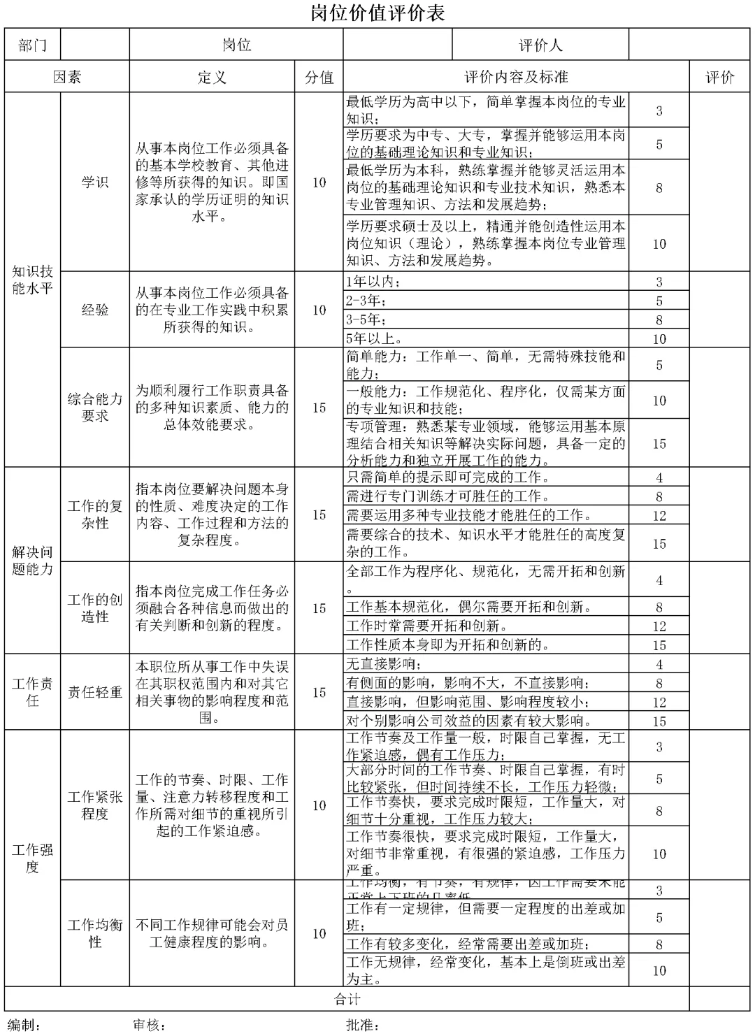 某公司岗位价值评价表(Excel文档)