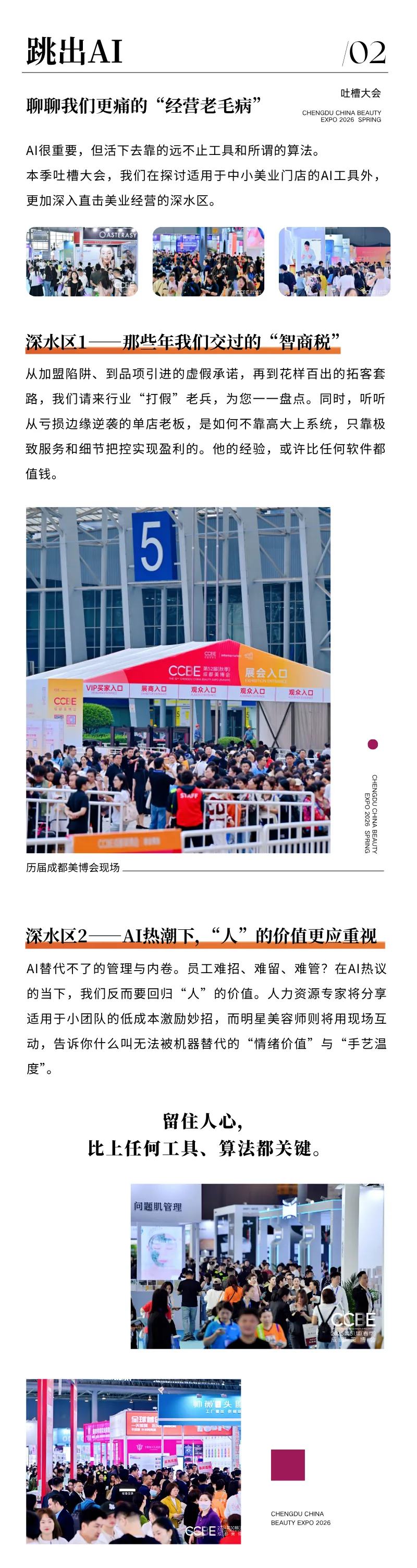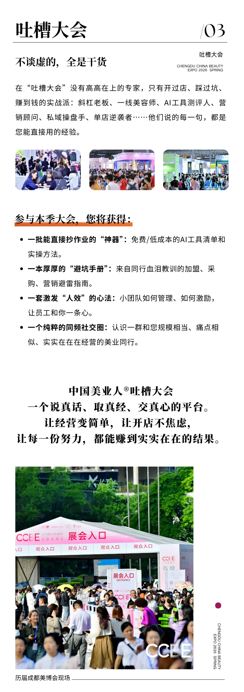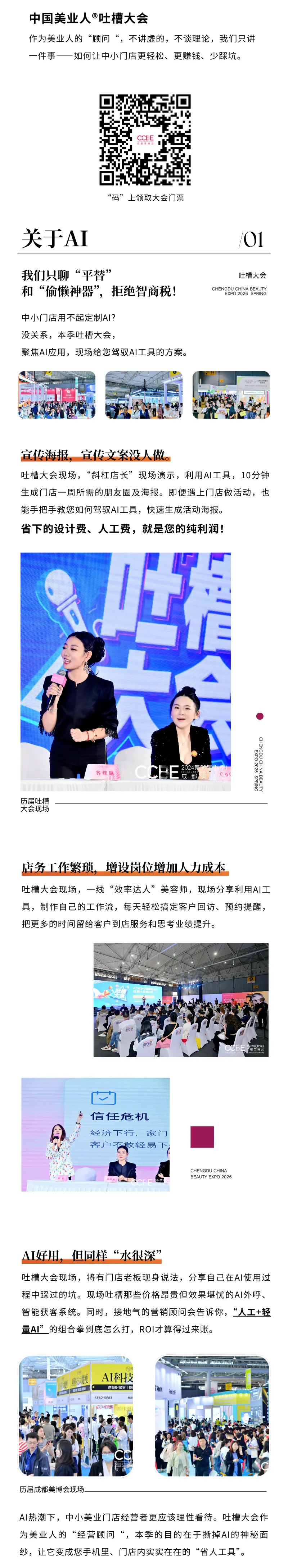美业门店追不上AI?这些工具拿来就能用,照样提升业绩 | 吐槽大会 CCBE 2026第7季中国美业人®吐槽大会 核心议题: AI工具的驾驭&经营避坑与回归本质 大会时间: 4月16日13:30-16:30 大会地址:世纪城6号馆 “码”上领取大会门票 END 2026第53届CCBE成都美博会 4月16-18日 成都世纪城新国际会展中心 800+源头企业 | 4,000+优质品牌 50,000+专业观众 | 55,000㎡展出面积 www.meibohui.com 精彩内容推荐👇 点击 阅读原文 领取成都美博会门票 #吐槽大会#美业人#CCBE#成都美博会#AI#AI工具