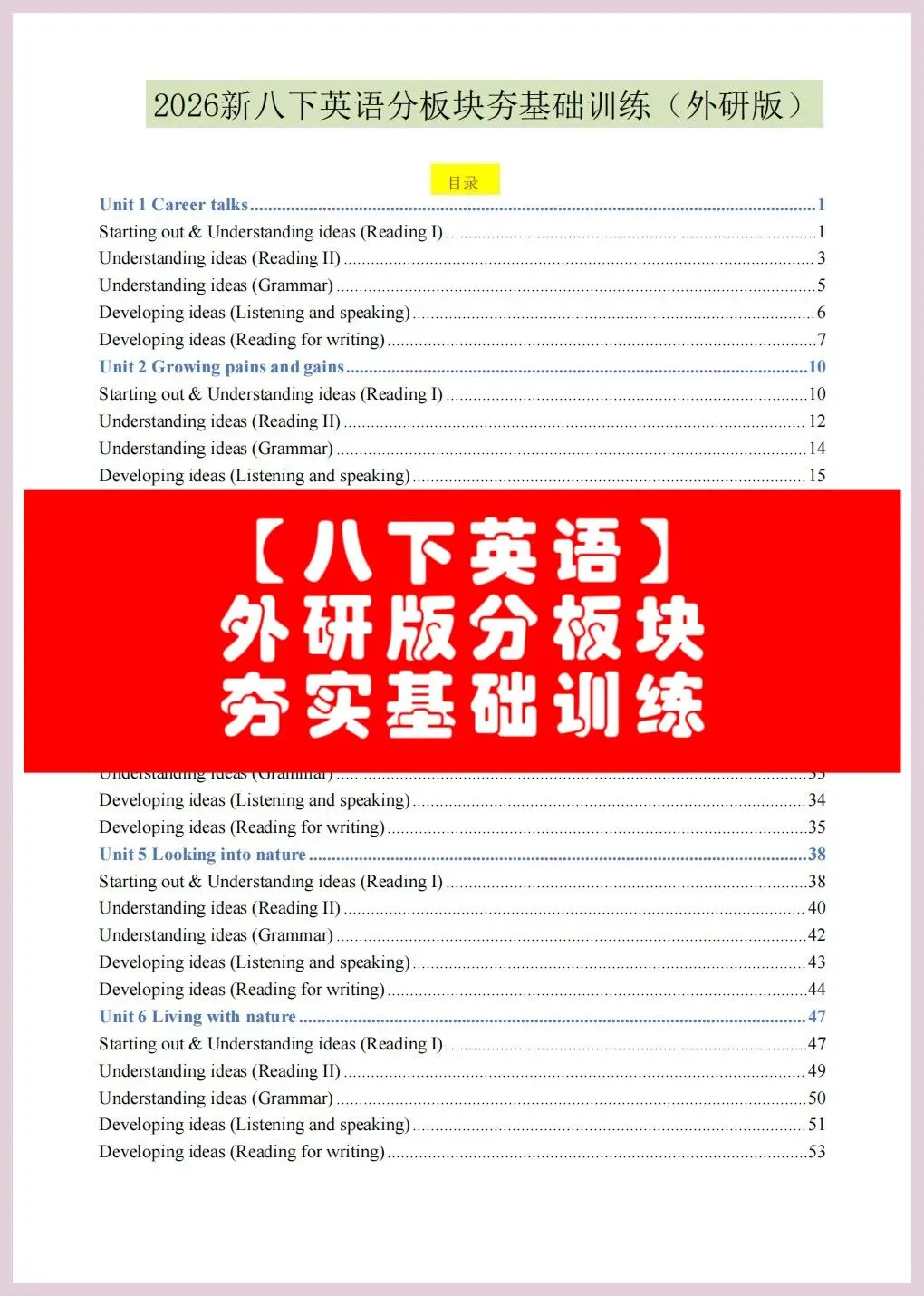 夯实基础| 2026春外研版八年级下册英语全册Unit1-6分板块夯实基础训练,有完整! 点击蓝字,关注我们 文末有完整电子版领取方式 展示部分内页 END 领取完整电子版: ①:点一点右下角的“赞”和“在看”,感谢!🙏 ②:扫描下方二维码领取完整版资料! HI~新朋友,点击下方“公众号”可以关注我哦! 点点点,赞和在看都在这儿!