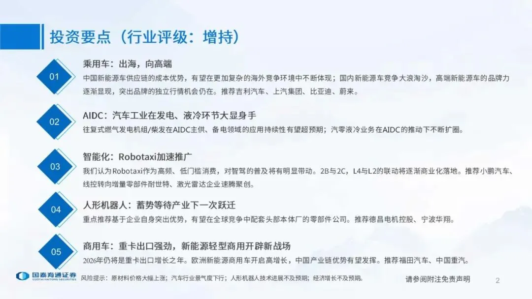 中国新能源车供应链的成本优势,有望在更加复杂的海外竞争环境中不断体现;国内新能源车竞争大浪淘沙,高端新能源车的品牌力逐渐显现,突出品牌的独立行情机会仍在。推荐吉利汽车、上汽集团、比比亚迪、蔚来。