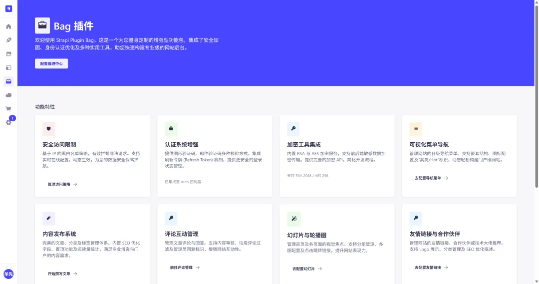 strapi-plugin-bag 是一款专为 Strapi 5 设计的综合性业务增强套件。
