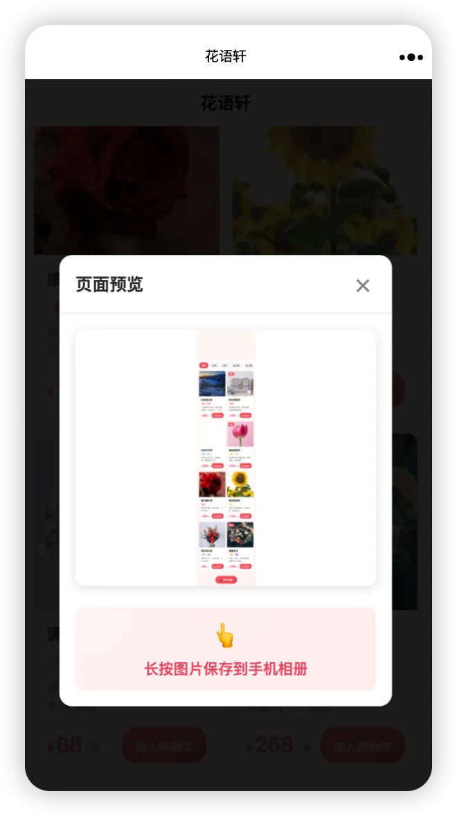 <!-- 保存页面按钮 --><viewclass="save-page-section"><viewclass="save-btn" @click="savePage"><textclass="save-icon">📷</text><textclass="save-text">保存页面</text></view></view><!-- 弹窗 --><viewclass="preview-modal"v-if="showPreviewModal" @click="closePreviewModal"><viewclass="modal-content" @click.stop><viewclass="modal-header"><textclass="modal-title">页面预览</text><textclass="modal-close" @click="closePreviewModal">×</text></view><viewclass="modal-body"><imagev-if="previewImage":src="previewImage"mode="aspectFit"class="preview-image"show-menu-by-longpress /><viewclass="preview-tip"><textclass="tip-icon">👆</text><textclass="tip-text">长按图片保存到手机相册</text></view></view></view></view>