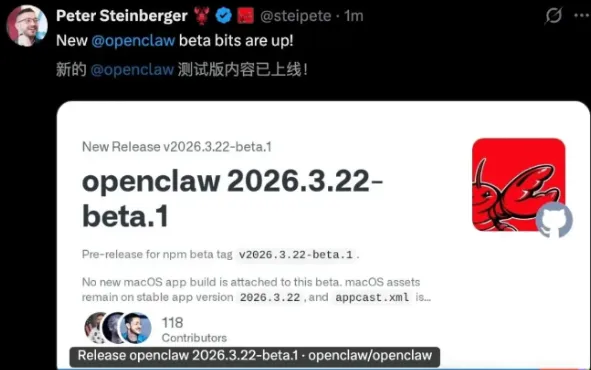 就在刚刚,OpenClaw 项目创始人 Peter Steinberger 重磅官宣,OpenClaw 2026.3.22-beta.1 预览版正式上线。