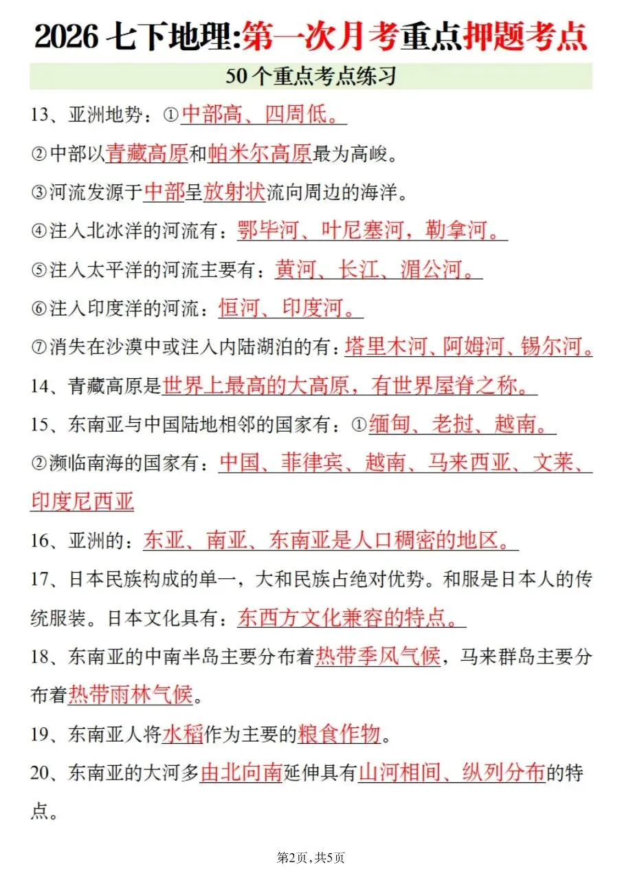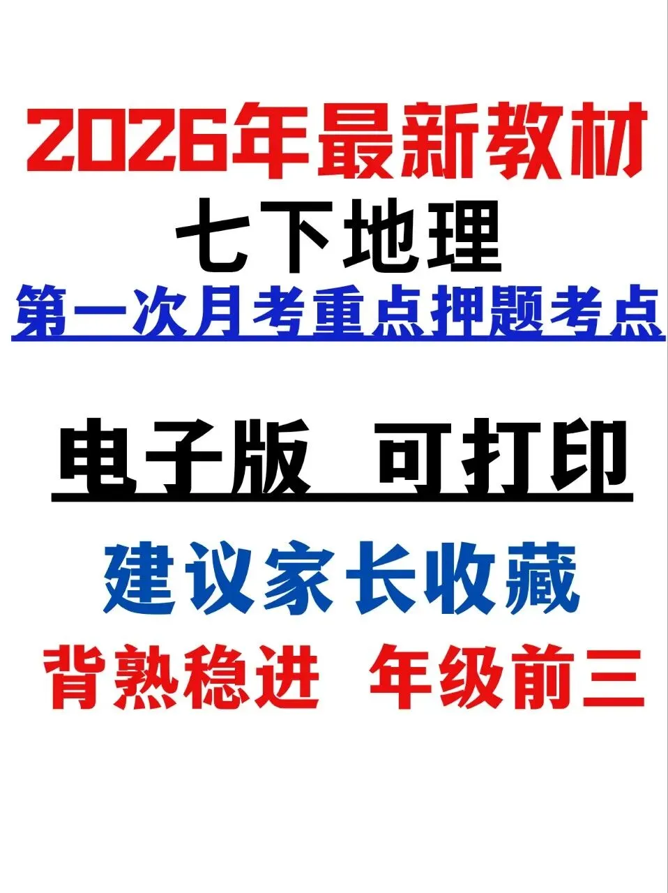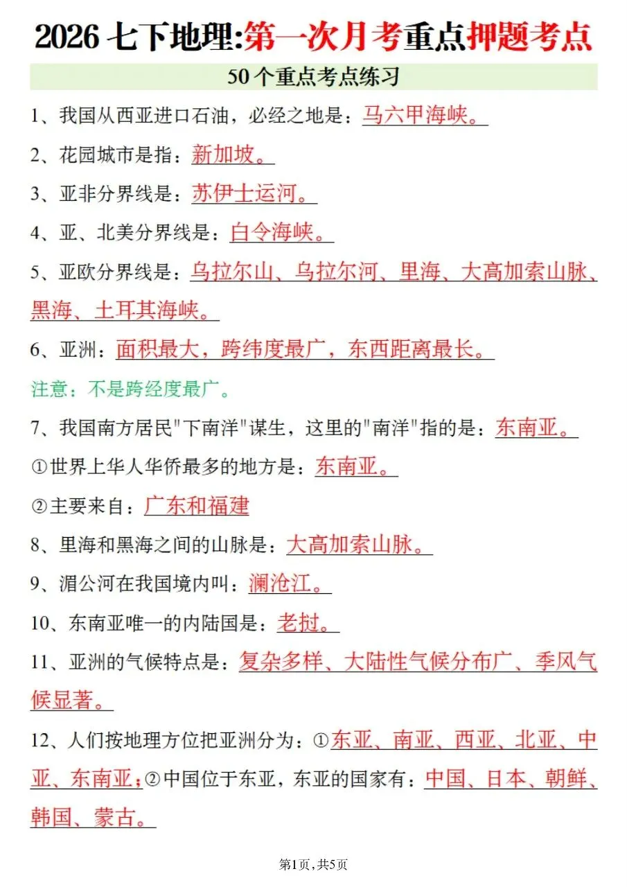 老师精心整理的2026最新教材七下地理第一次月考重点押题考点,完全贴合课本内容,直击月考高频考点,把必背知识点、地图识图、简答题思路全都梳理到位。