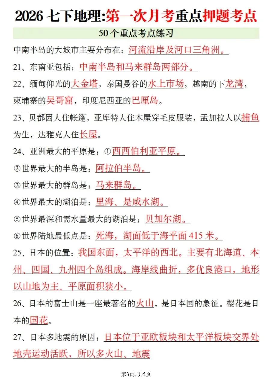 七下地理第一次月考稳拿满分!这份押题考点太实用了!
