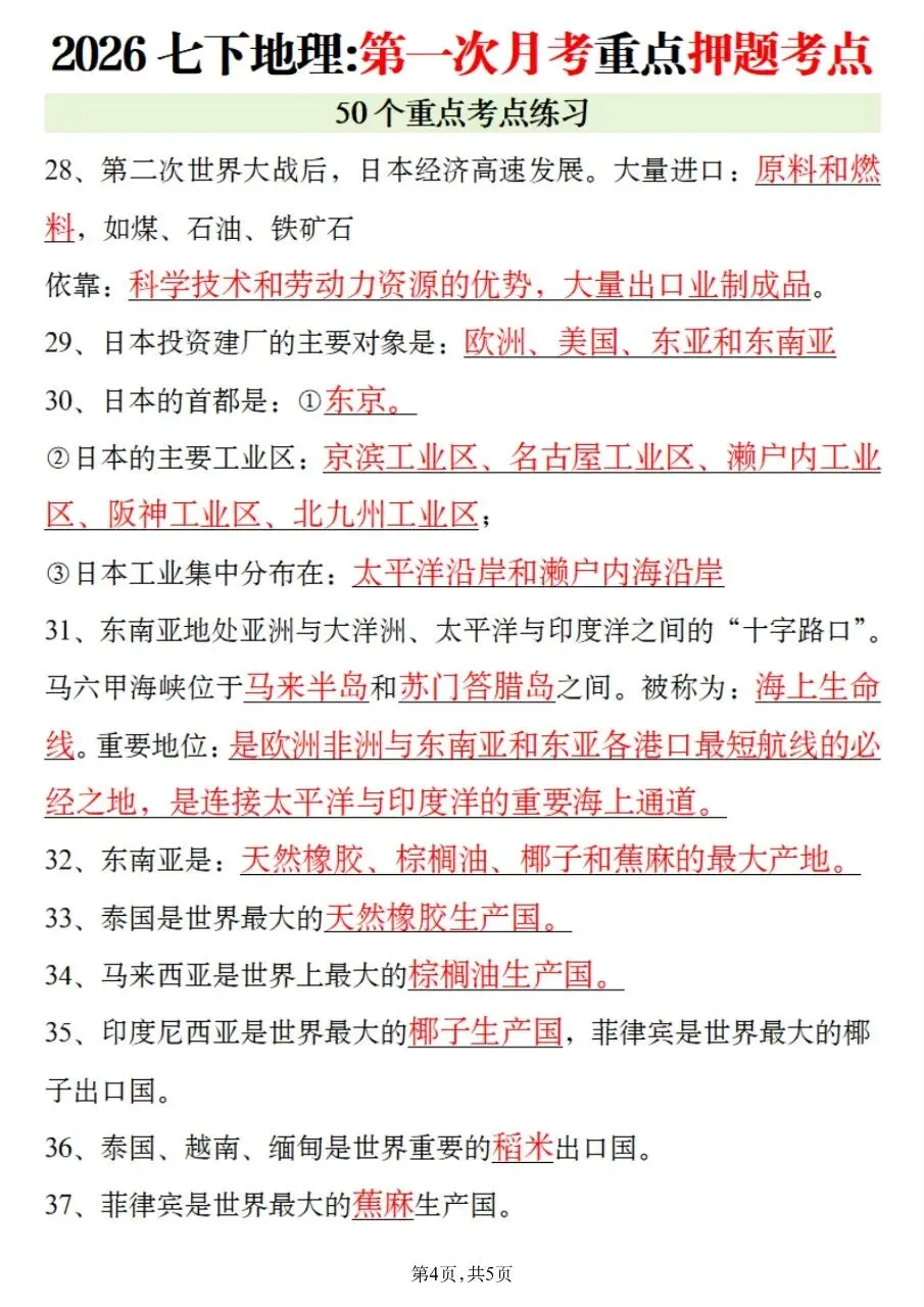 2026年最新版七年级下册地理第一次月考重点押题考点,有完整可打印,学霸学习好帮手,建议家长打印,学霸人手一份!