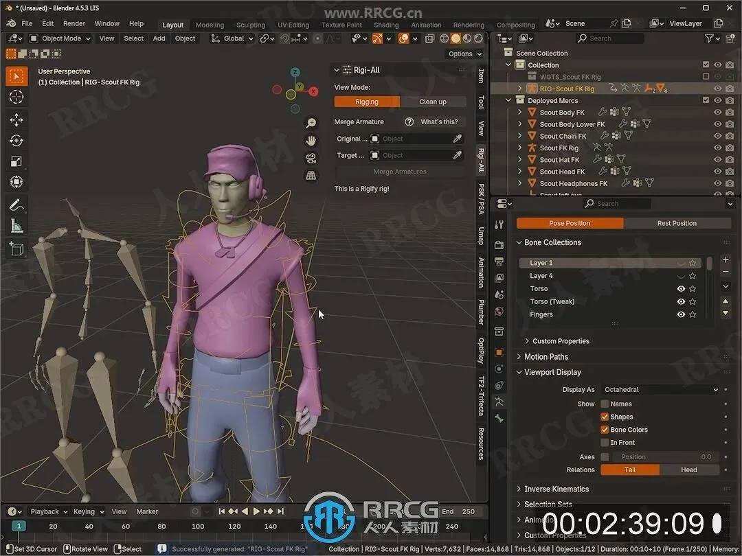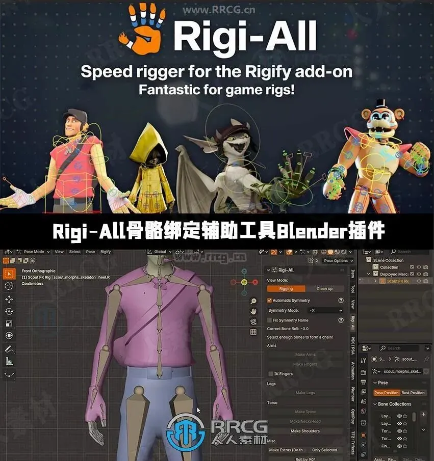 本插件是关于Rigi-All骨骼绑定辅助工具Blender插件V1.6.0版,大小:289 KB,支持Blender 4.2 – 5.1版软件,支持Win系统,语言:英语。人人CG分享Rigi-All是一款专为Blender设计的骨骼绑定辅助插件,旨在显著提升Rigify(Blender高级骨骼系统)的工作效率。该插件专注于简化人形角色(尤其是双足四肢结构)的骨骼创建流程,通过自动化处理繁琐步骤,让用户能够快速生成高质量的动画骨骼。其核心功能包括一键生成四肢、脊柱、颈部、手指等复杂骨骼链。插件具备智能对称识别能力,能根据骨骼命名自动匹配左右对称结构,并支持自定义对称关键词。此外,Rigi-All提供独特的骨骼合并工具,可将原始骨骼与生成的Rigify元骨骼完美融合,保留原始旋转数据的同时获得Rigify全功能控制系统——这项特性对游戏角色换装系统开发尤为关键。插件还包含后期清理工具,能自动处理顶点组命名与骨骼对应关系,确保网格变形与动画控制系统无缝衔接。通过将复杂技术流程封装为直观的面板操作,Rigi-All既保持了Rigify的专业性,又大幅降低了使用门槛,是角色动画师和技术美术工作流程中的得力助手。