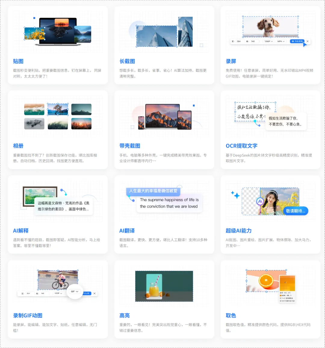 功能更全面一些,除了基础截图和贴图之外,它还支持长截图、OCR 识别,甚至还有翻译能力。可以说,Snipaste 有的它基本都有,而且在功能丰富度上更进一步。